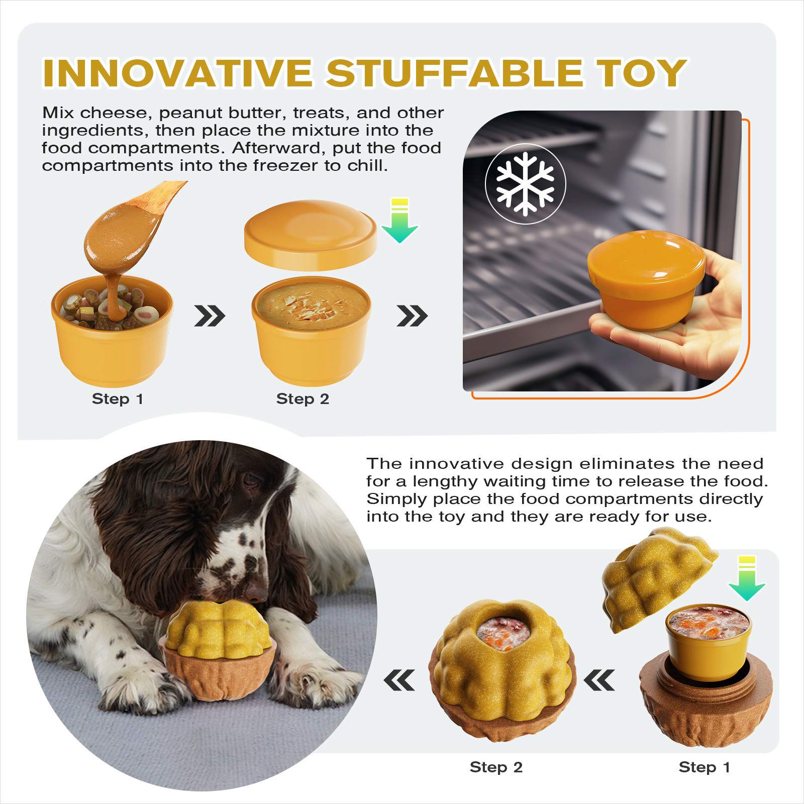 3[Frozen Licking Toy] Fill the food compartment with ingredients like meat paste, yogurt, pumpkin, meat chunks, or cheese, then cover it and freeze. After freezing, insert the food compartment into the toy for your dog to enjoy licking. This process helps expend excess energy and enrich your dog’s daily life;