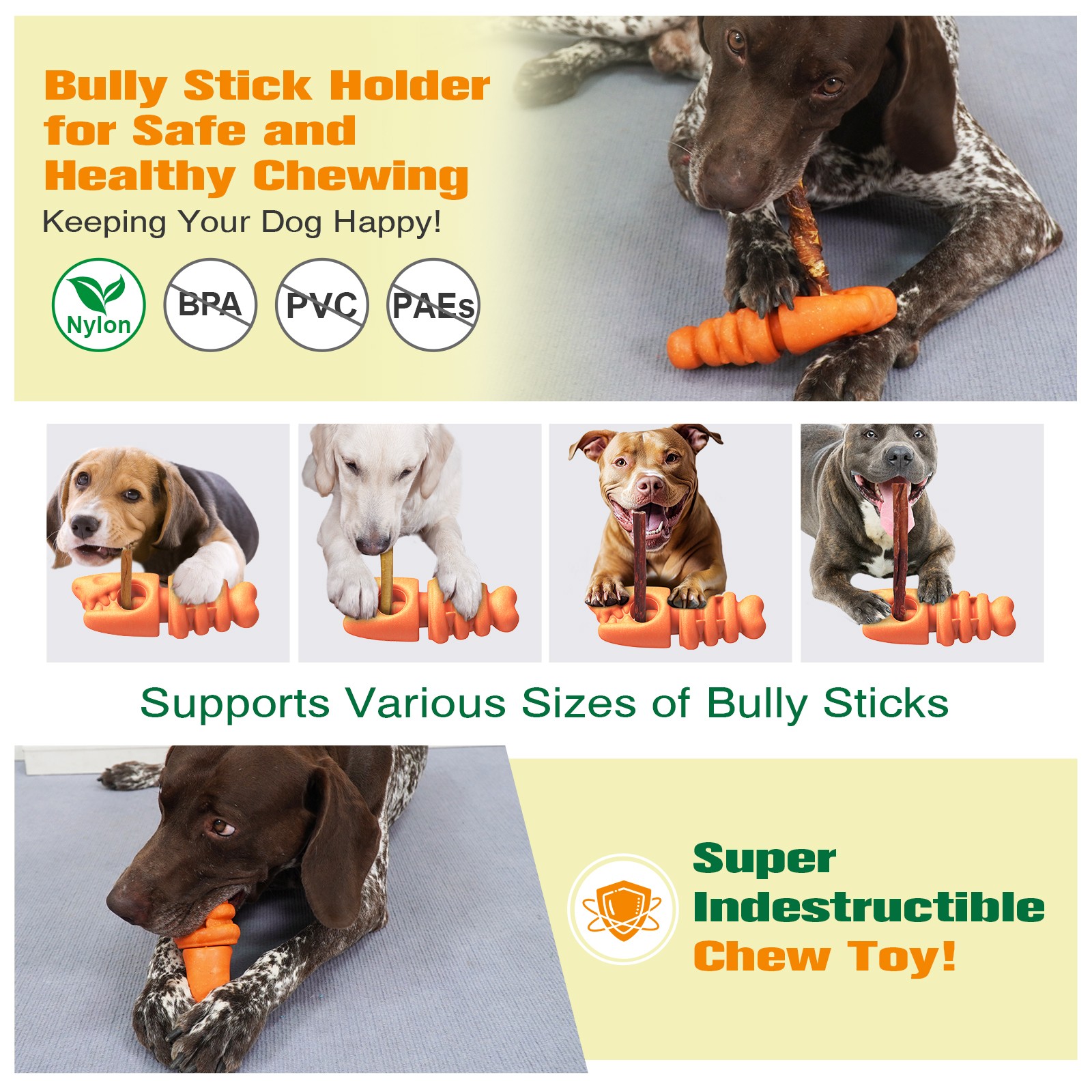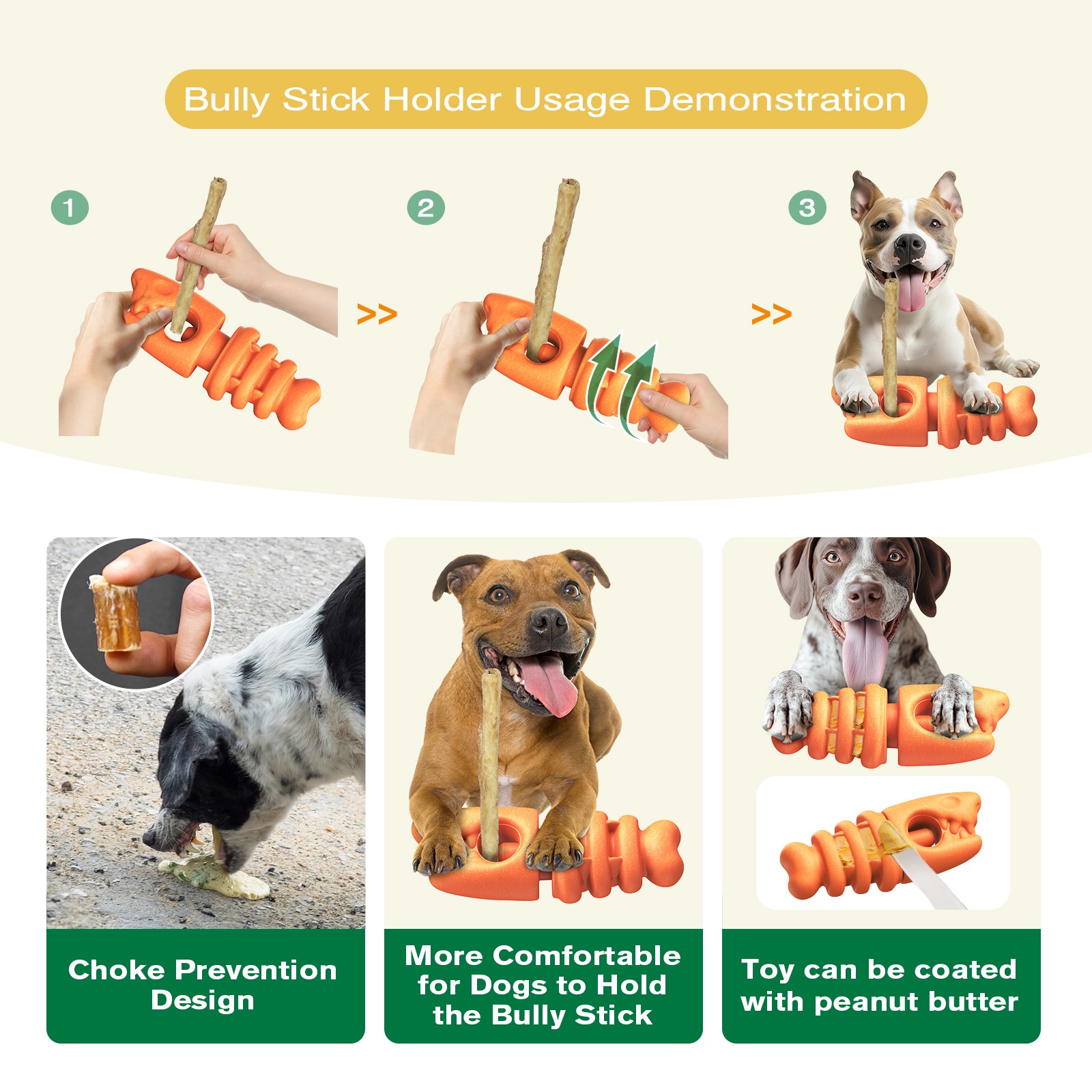 1[Multi-functional Safety Toy] This is a stand designed to securely hold bully sticks, preventing choking and blockage risks while your dog chews. You can provide stick-shaped treats for your dog to chew on happily without worrying about safety issues. This toy is sturdy and durable, making it ideal as a chew toy. The stand is compatible with all treat sticks with a diameter smaller than 0.79 inches;